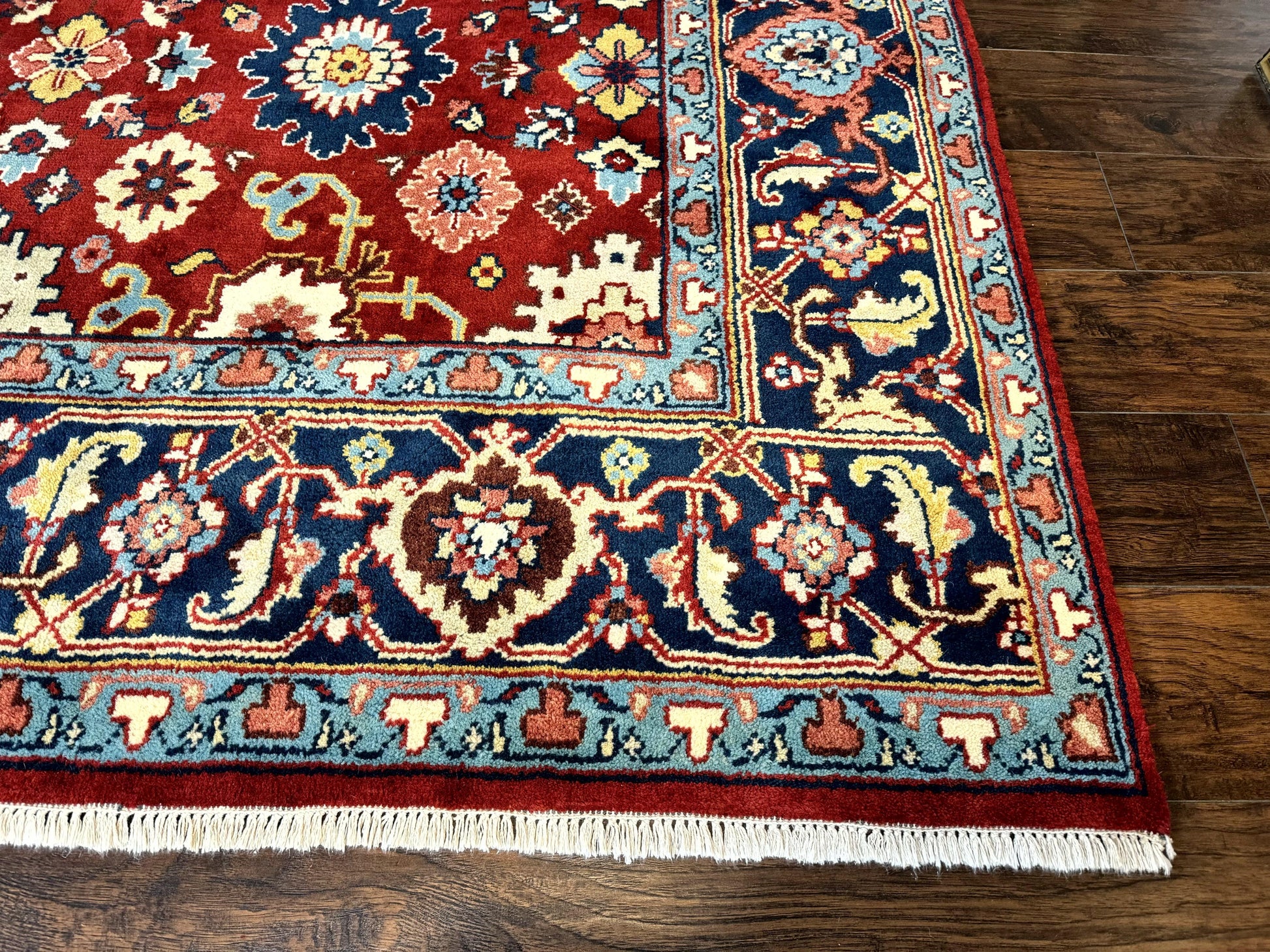 Indo Heriz Rug 8x10, Red and Navy Blue, Allover Pattern, Wool Handmade Carpet