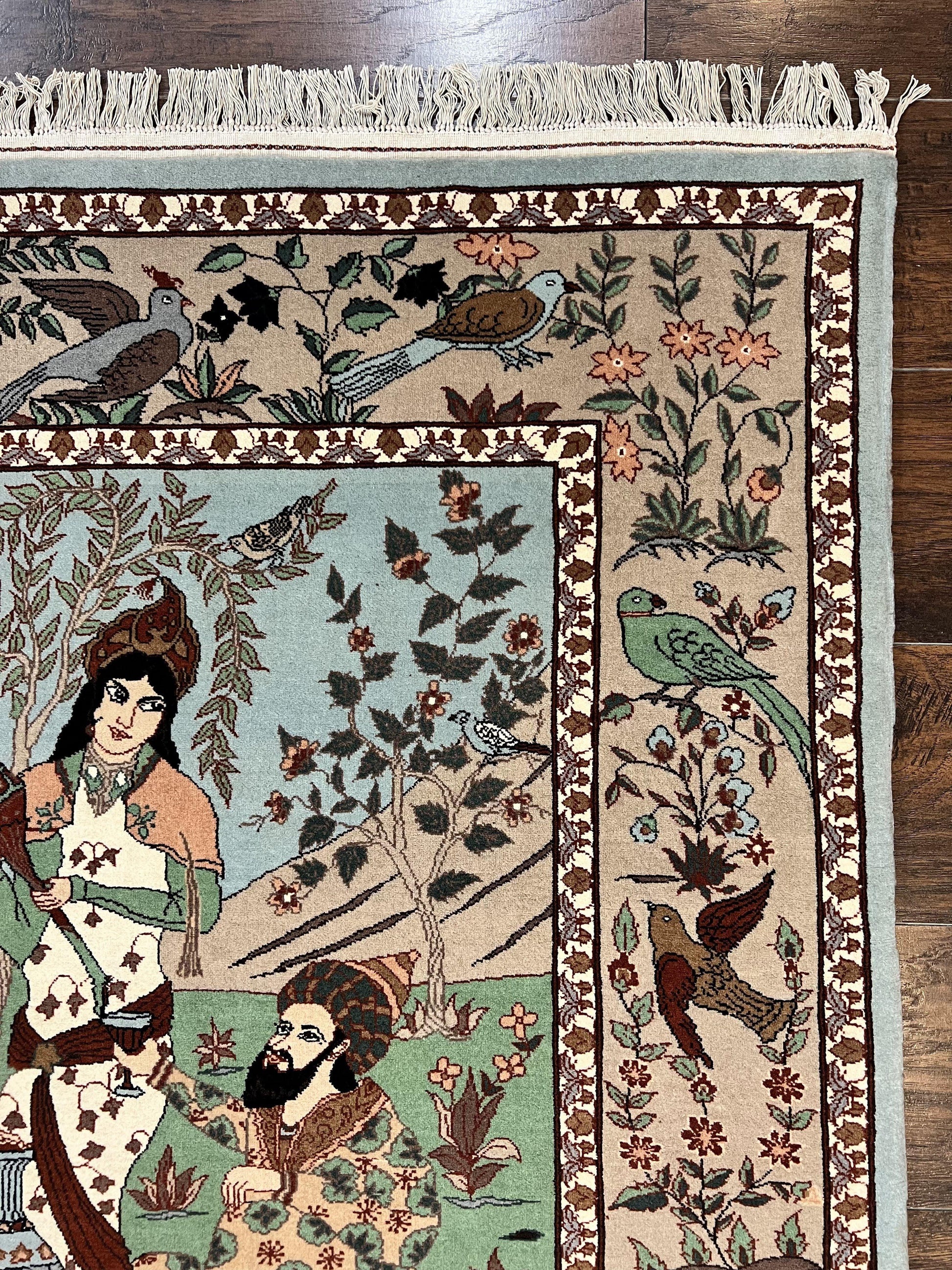 Indo Persian Pictorial Rug 4x7, Handmade Hand Knotted Wool Semi Antique Horizontal Carpet, Men & Women Drinking, Fine Rug, Bird Pictorials