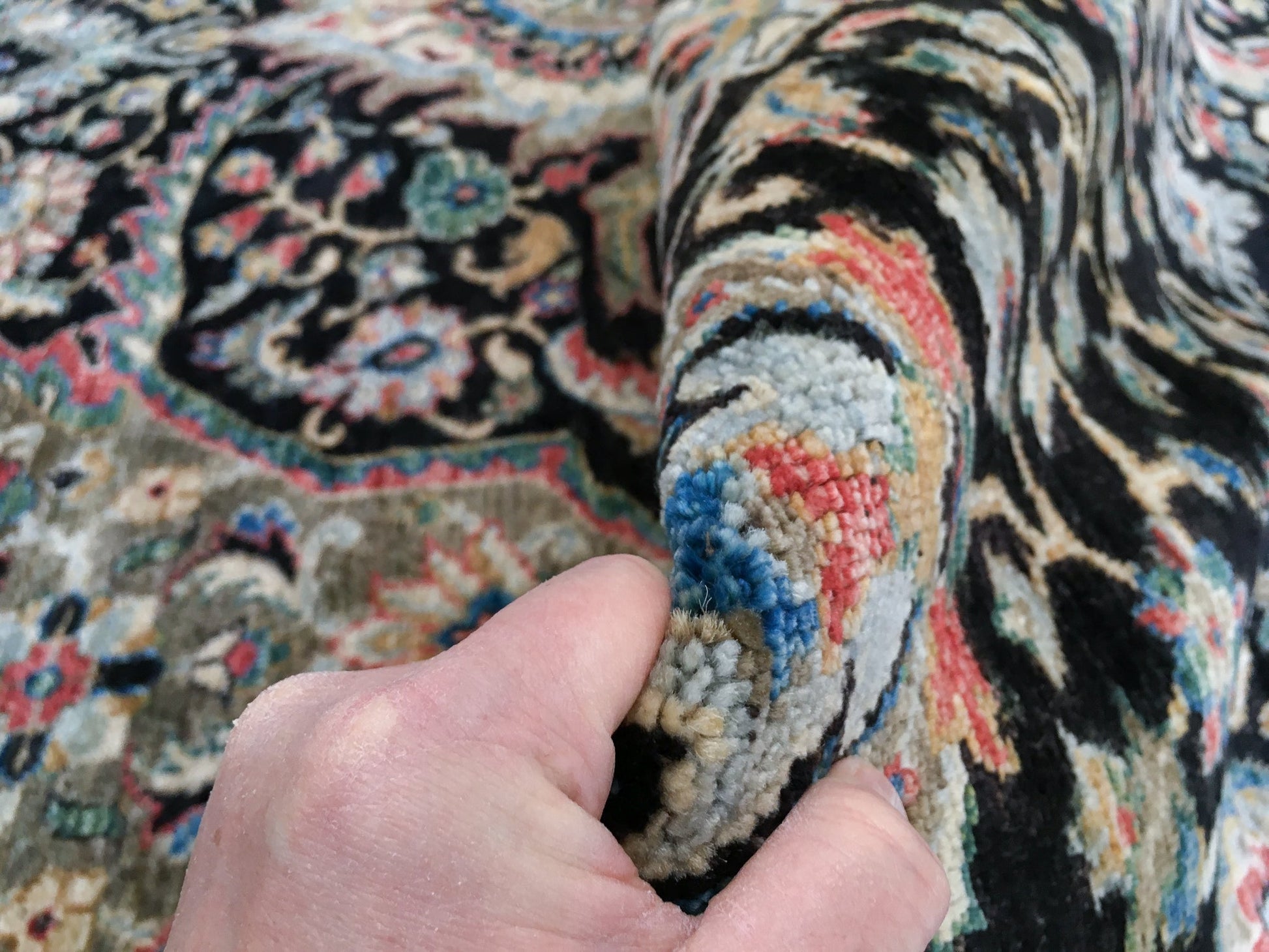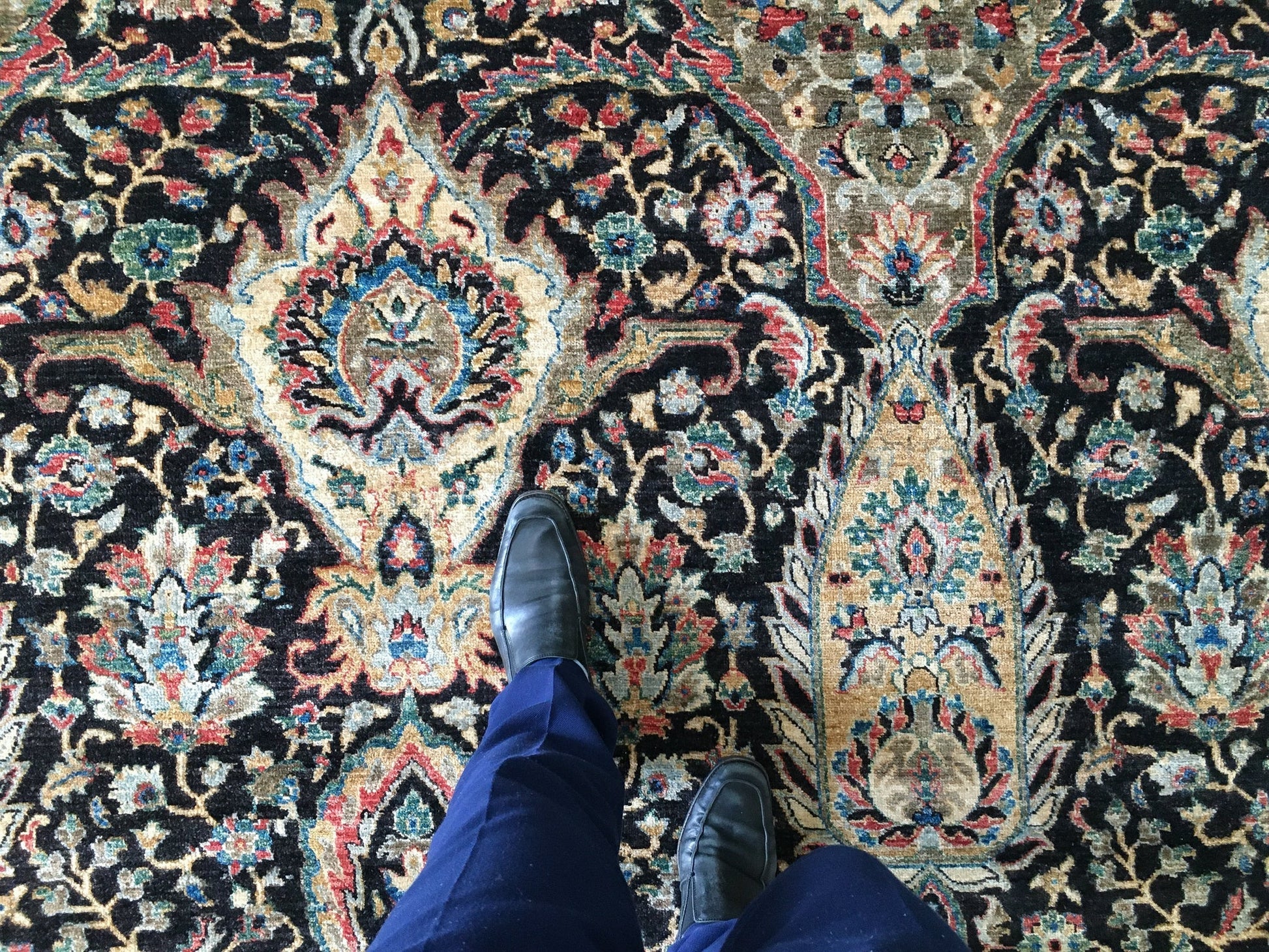 This striking Kirman design showcases the timeless elegance of traditional Persian aesthetics without constraining borders. Hand-knotted from hand-spun, vegetable-dyed Ghazni wool, each knot reflects authentic Afghan craftsmanship and the artisan's dedication to quality. The all-over pattern flows seamlessly across the deep black field, enriched by multicolor accents that create visual depth and sophistication. Expertly exported from Pakistan, this piece represents generations of weaving heritage and sustainable, natural dyeing practices that ensure lasting color and durability.