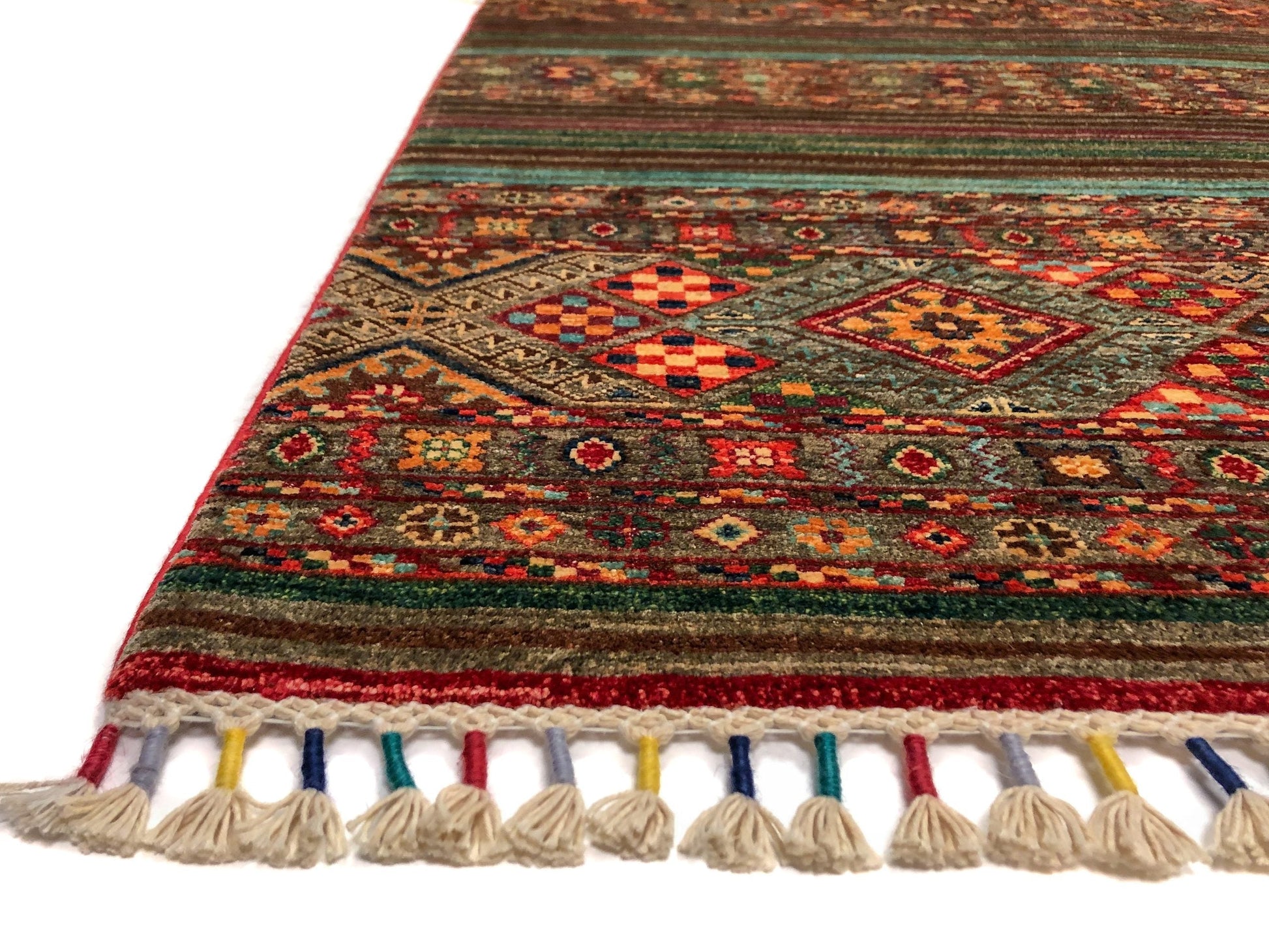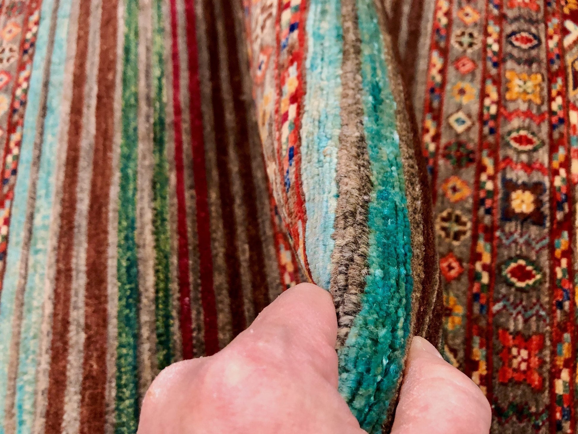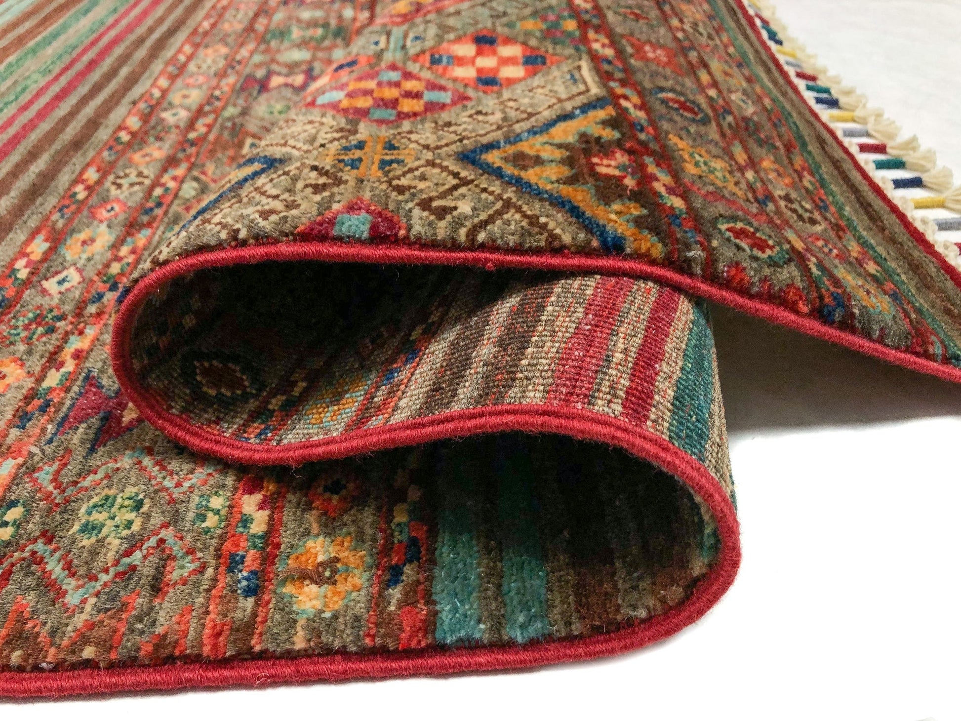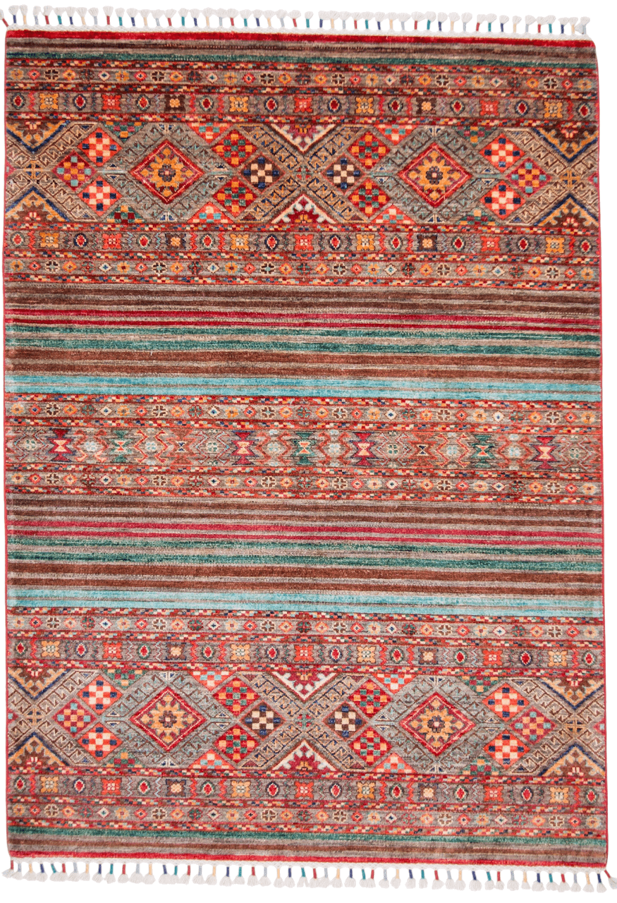 Horizontal Khorjin (Khurjeen) design – hand-knotted of hand-spun, vegetable-dyed Ghazni wool in Afghanistan; exported from Pakistan