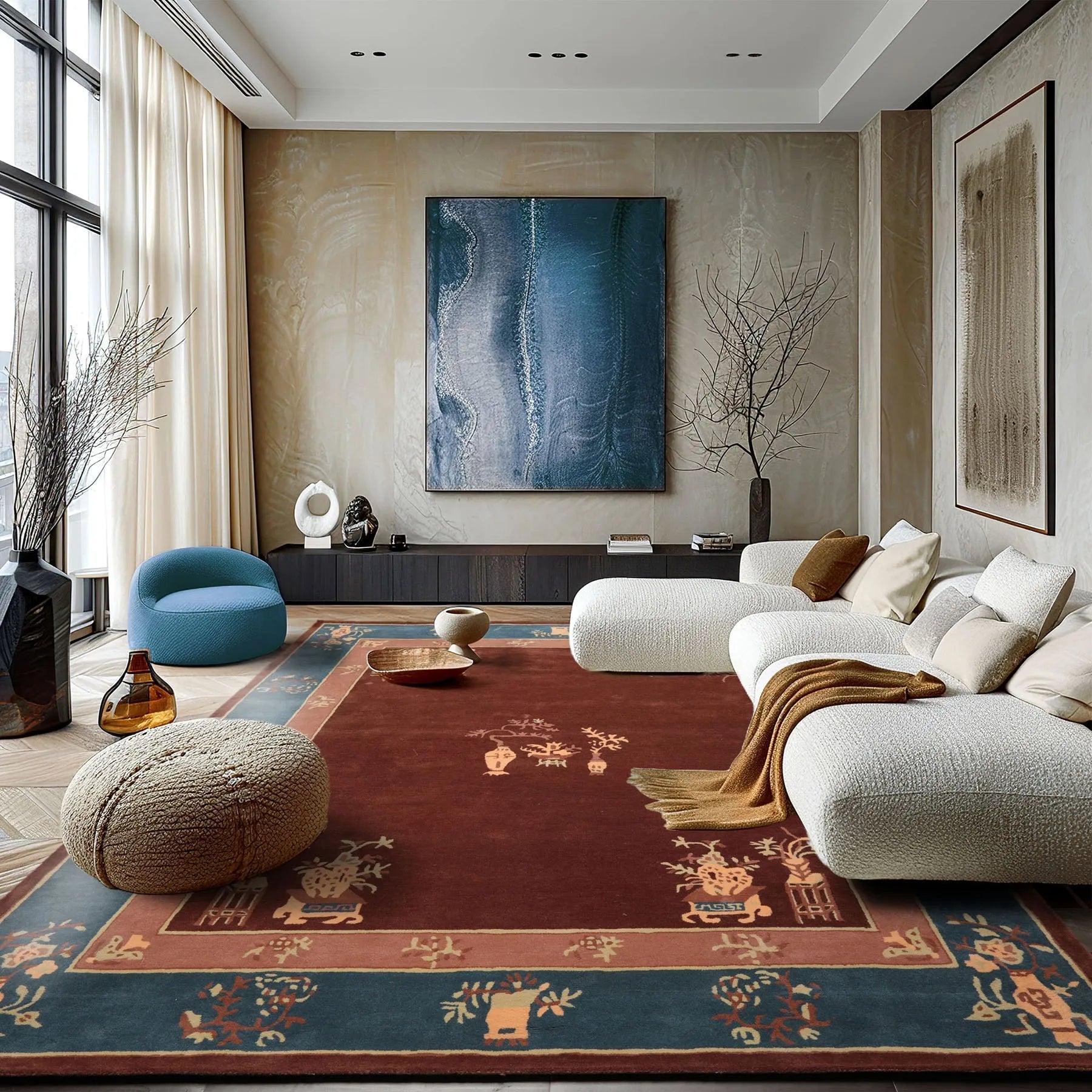 Story Behind the Art: Chinese Art Deco refers to a distinctive style of rugs that were crafted in China during the early 20th century, specifically during the Art Deco era, which spanned from the 1920s to the 1940s. They represent a harmonious blend of traditional Chinese craftsmanship and the modernist aesthetics of the Art Deco movement. These rugs feature jewel-toned hues like magenta, turquoise, emerald, ruby red, and violet, often contrasted with softer pastels. Their frequently used design elements include pastoral scenes, stylized trees, picturesque pagodas, dragons, clouds, mountains, exotic flowers like peonies and chrysanthemums, birds like cranes and phoenix etc. These rugs, now vintage and antique, are rare and invaluable. Our exclusive new collection, loomBloom Chinese Art Deco rugs is an ode to the eternal beauty and charm of these rugs. We have co-opted and reimagined these timeless designs to fit modern aesthetics. It offers an affordable option to authentic Chinese Art Deco rugs, without sacrificing the elegance and sophistication of the originals. These rugs are hand tufted/handmade & available at superbly competitive prices.