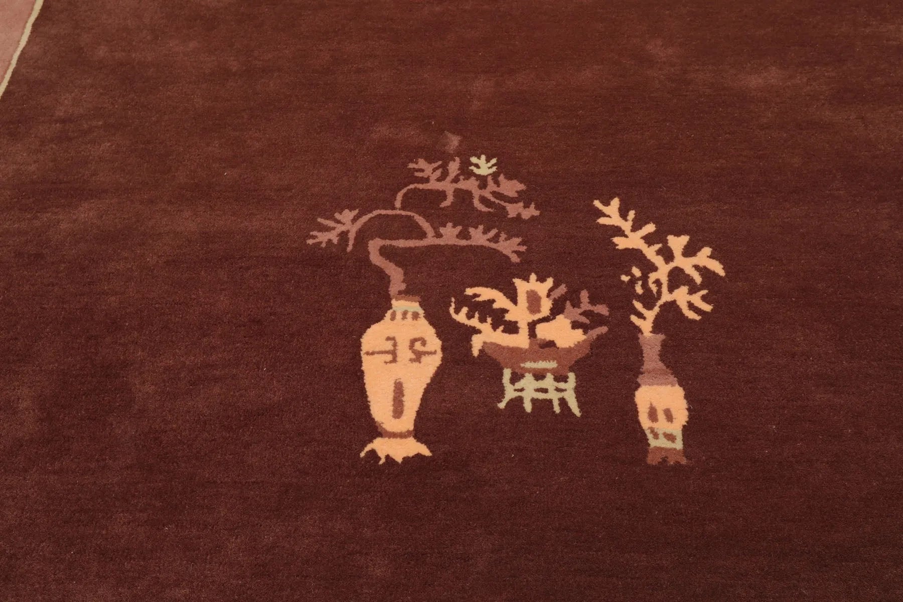 The exquisite Loombloom Chinese Art Deco Rug before you is from India and is a masterful blend of simplicity and refined elegance. The rug features a rich brown inner field helmed by a stunning multi band border. The central field is adorned with beautifully arranged vases that are symmetrically positioned, creating a balanced and harmonious composition that symbolizes abundance, growth, and prosperity. Surrounding the inner field is a vibrant rose and turquoise border, which not only frames the central composition but also continues the theme of ornate vases. These vases, echoing the design within the inner field, are interspersed along the border, creating a sense of continuity and flow throughout the rug. The juxtaposition of the rich brown field with the soft rose and bold turquoise border creates a visually striking contrast, while the warm and cool tones work together to offer elegance and vibrancy. Handcrafted in India from premium New Zealand wool, this rug combines luxurious texture with durable craftsmanship, making it a timeless addition to any space.