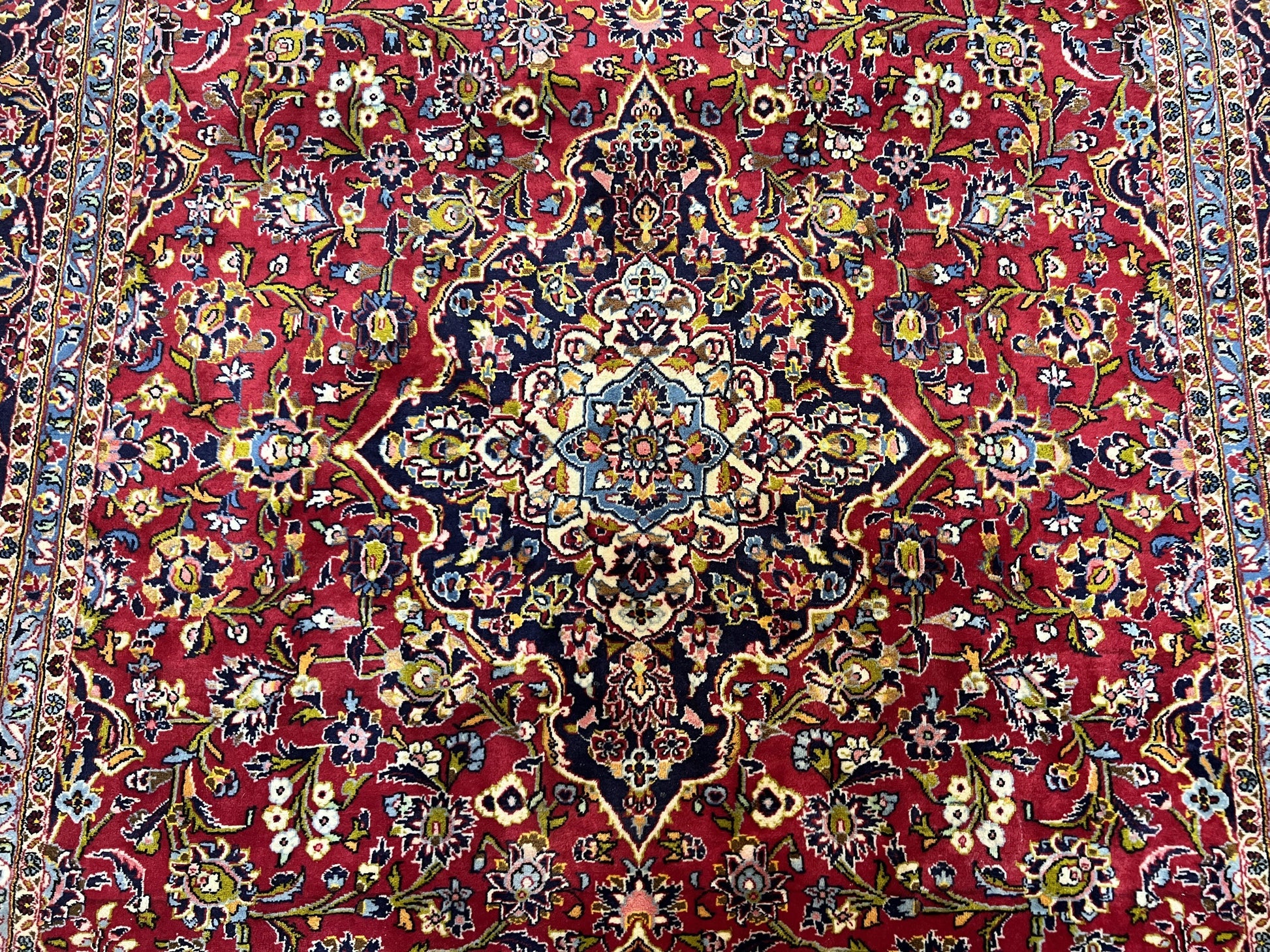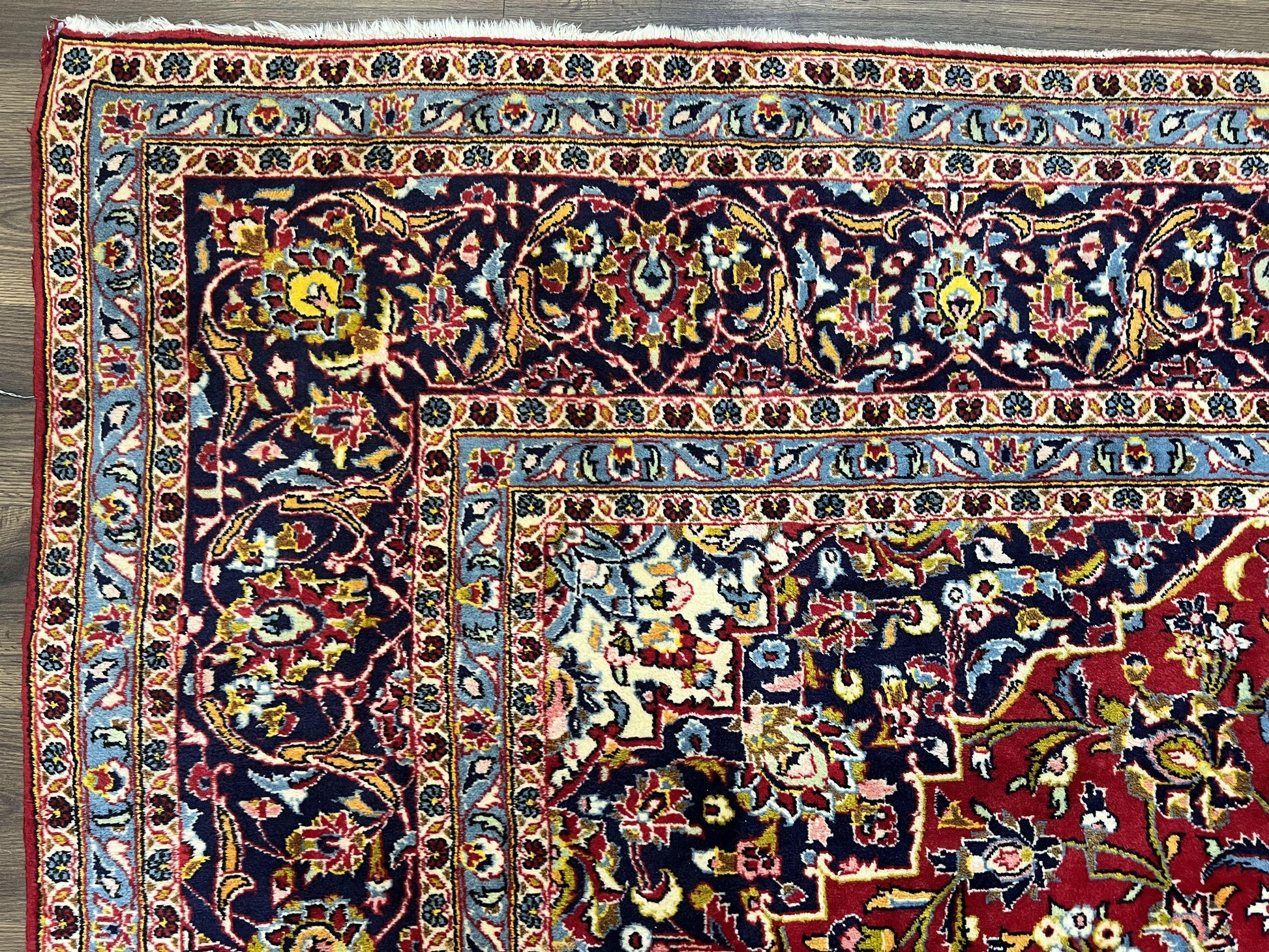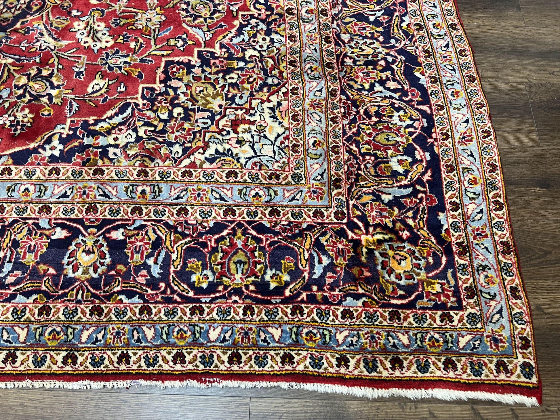 Persian Kashan Rug 9x12, Red Navy Blue, Allover Floral Medallion & Corner Design, Handmade Wool Oriental Carpet, Semi Antique Traditional Carpet