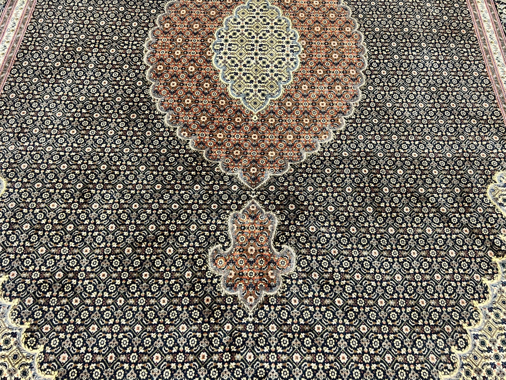 | Condition/Notes | Very good condition. Very finely hand knotted, with a knot density of 330 KPSI (50 Raj). Free of stains, odors, discolorations, tears, etc. Recently cleaned and ready to be enjoyed in your space. |
