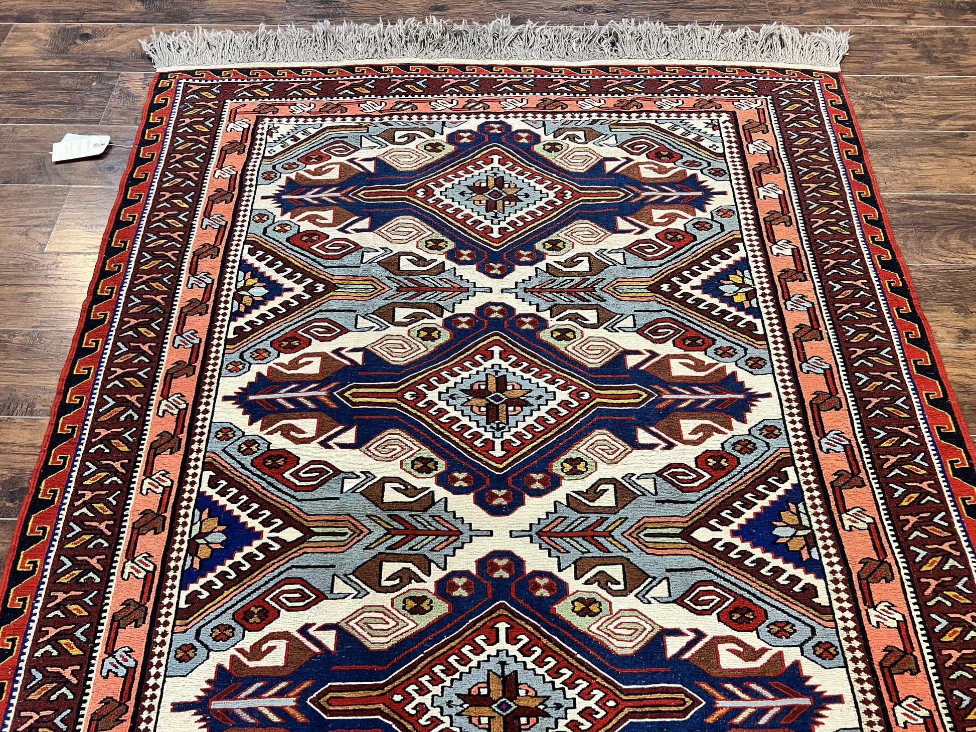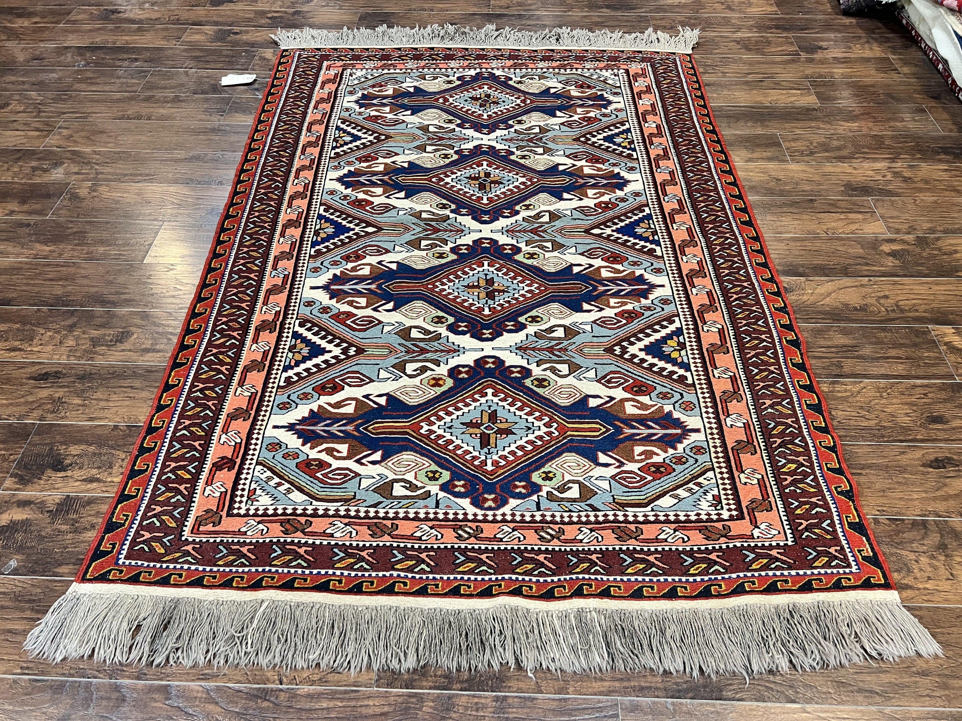 Russian Soumak Rug 6x8, Wool Handmade Antique Kilim Carpet, Multicolor 6 x 8 Geometric Medallions Caucasian Rug, Medium Size