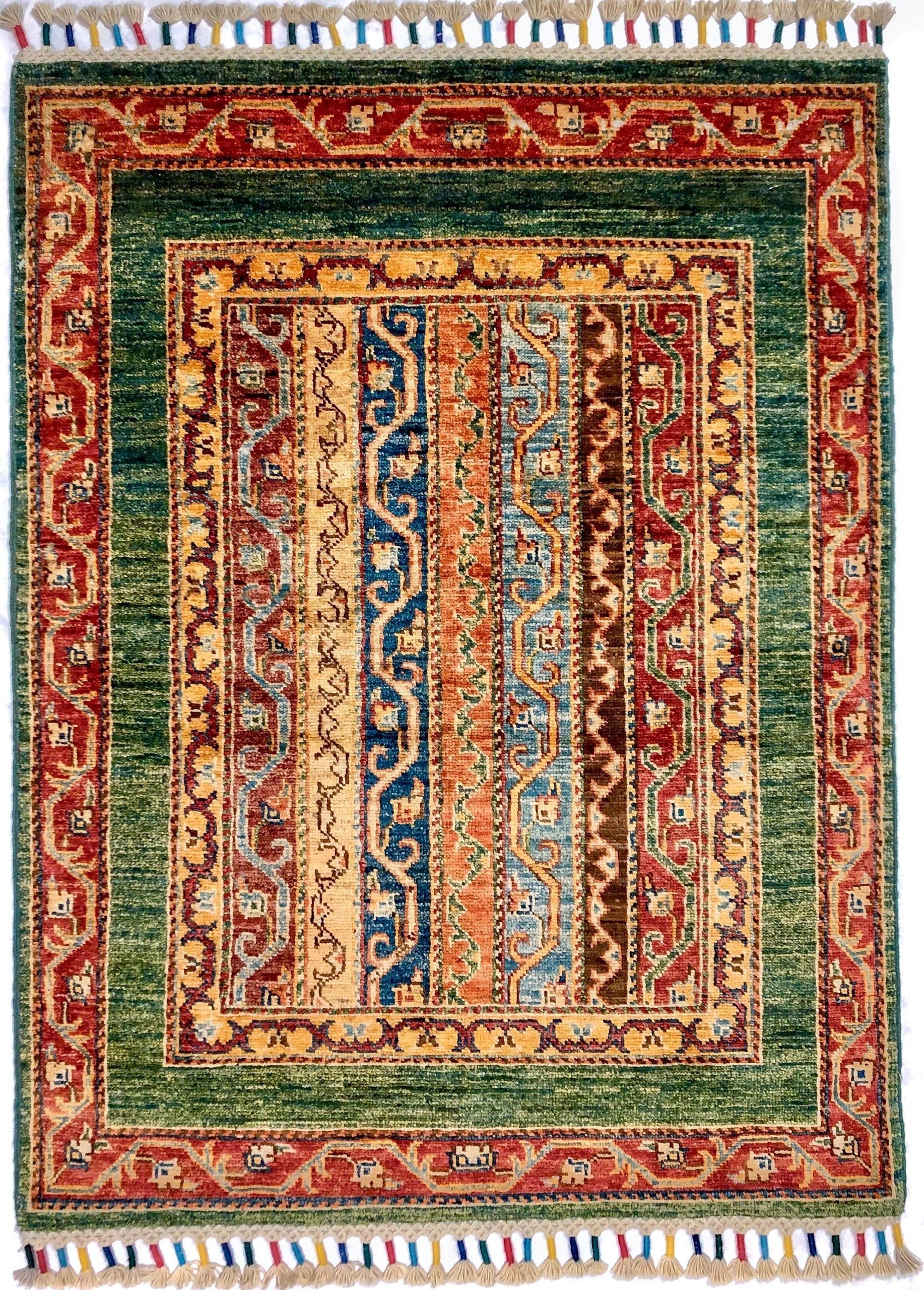 Turkish Shawl design with decorative fringe – hand-knotted of hand-spun, vegetable-dyed Ghazni wool in Afghanistan; exported from Pakistan