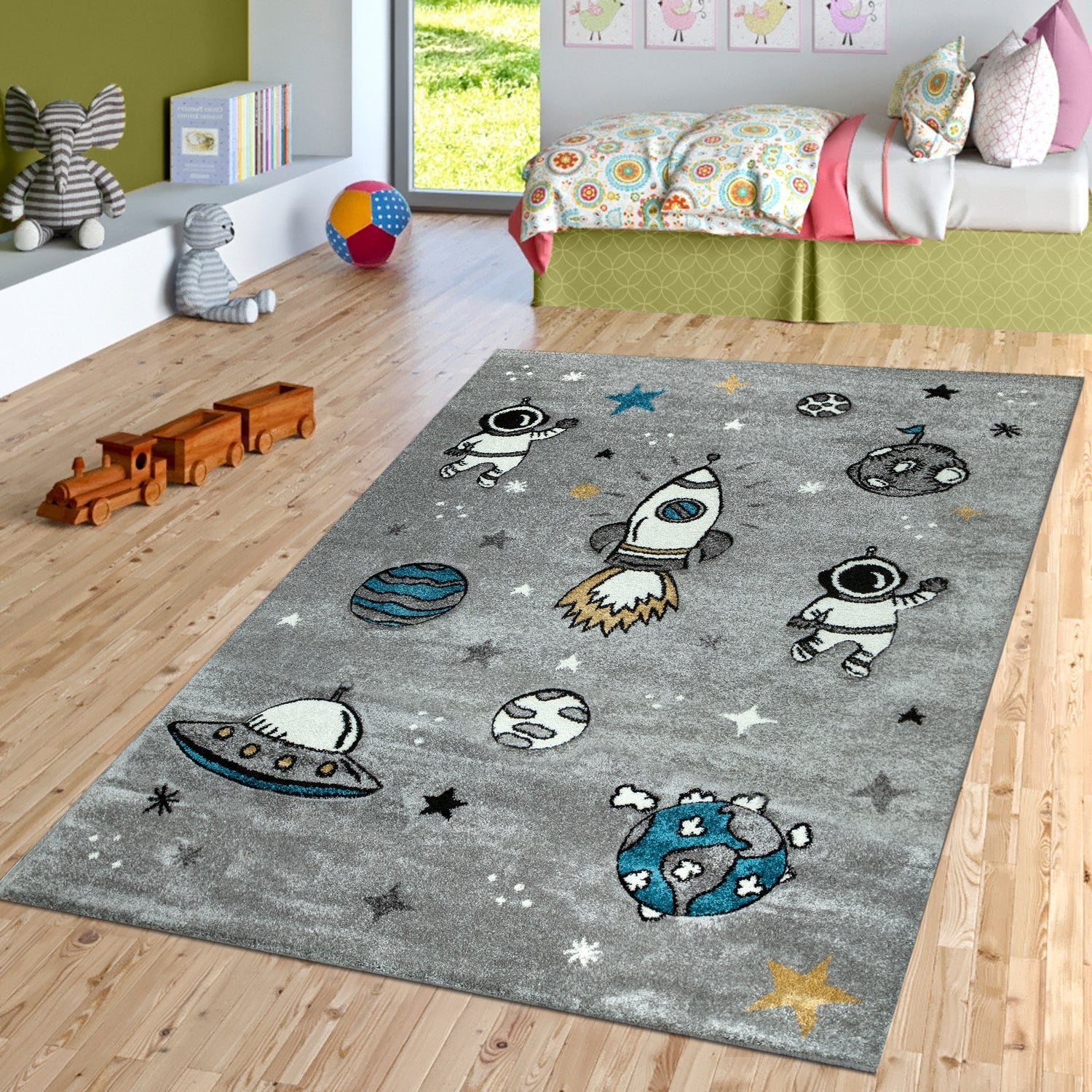 Space Rug for Kids with Astronauts & Rockets in Grey