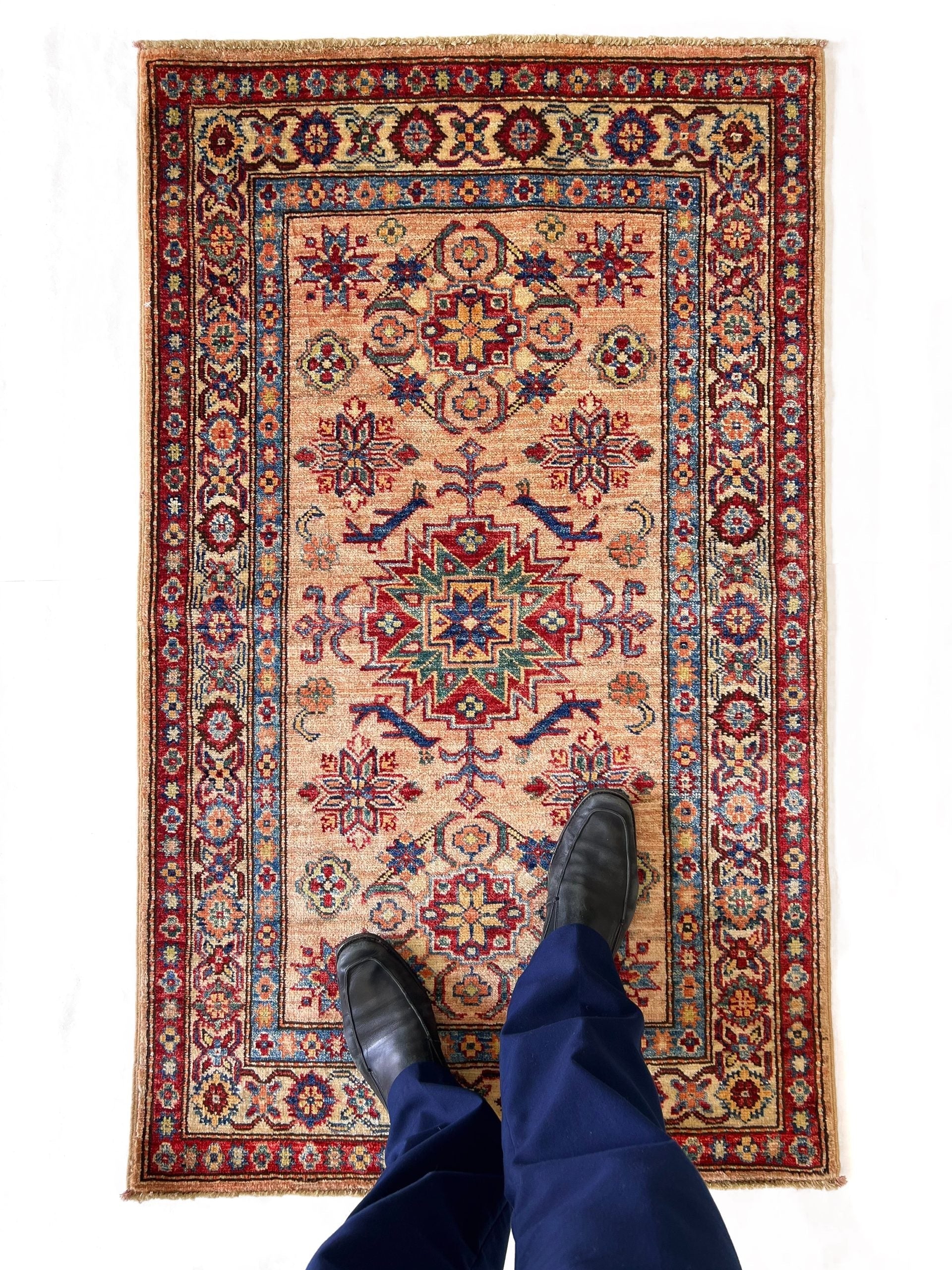 Super Kazak – hand-knotted of hand-spun, vegetable-dyed Ghazni wool from Afghanistan – exported from Pakistan
