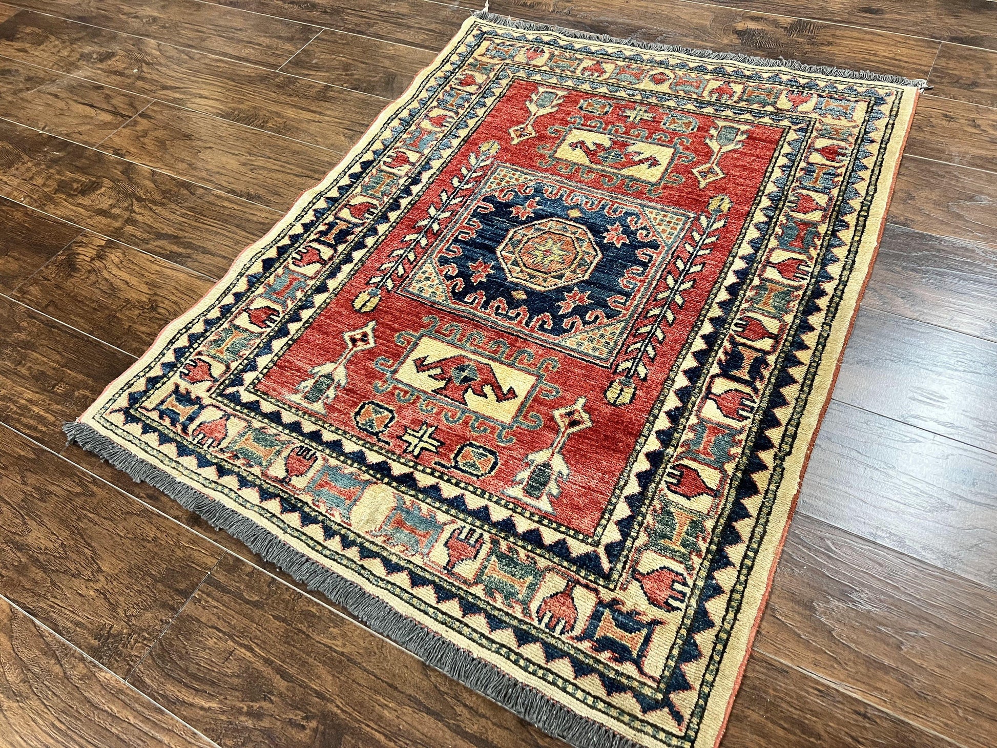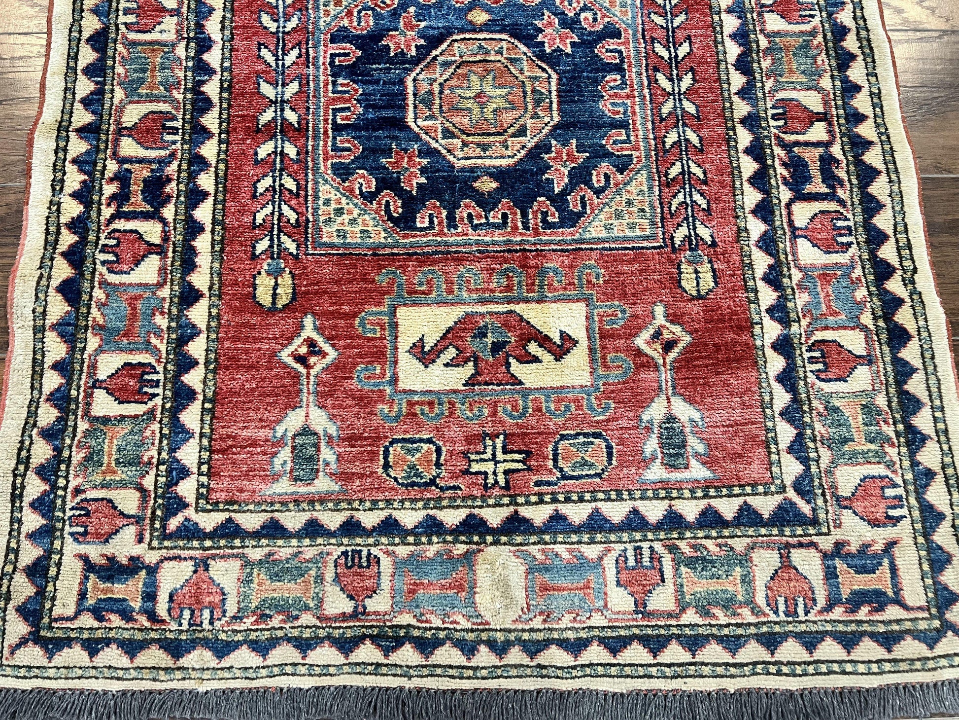 Turkish Kazak Rug 3x4, Wool Hand Knotted Small Vintage Carpet, Red Navy Blue, 3 x 4 Oriental Rug, Geometric Design