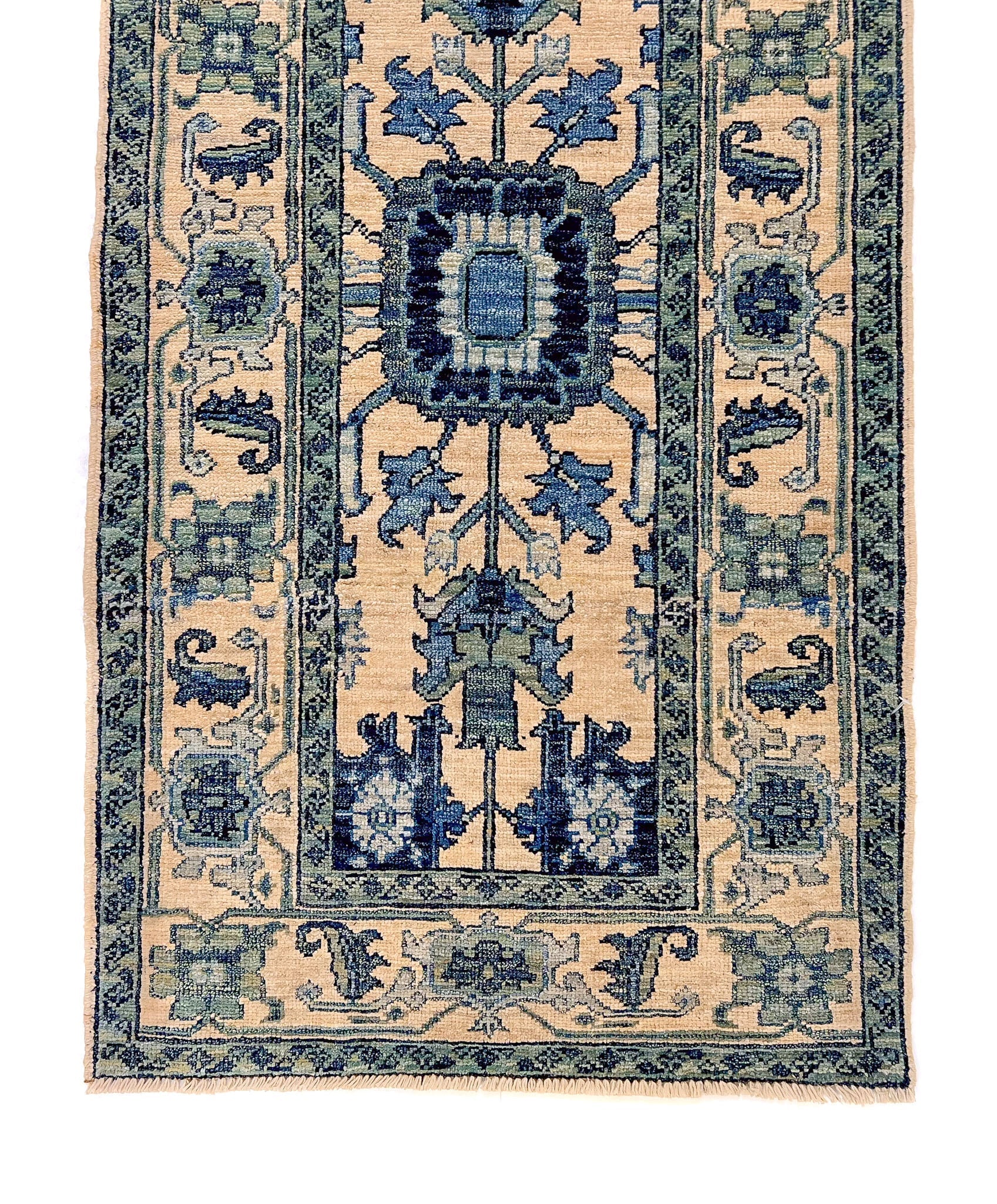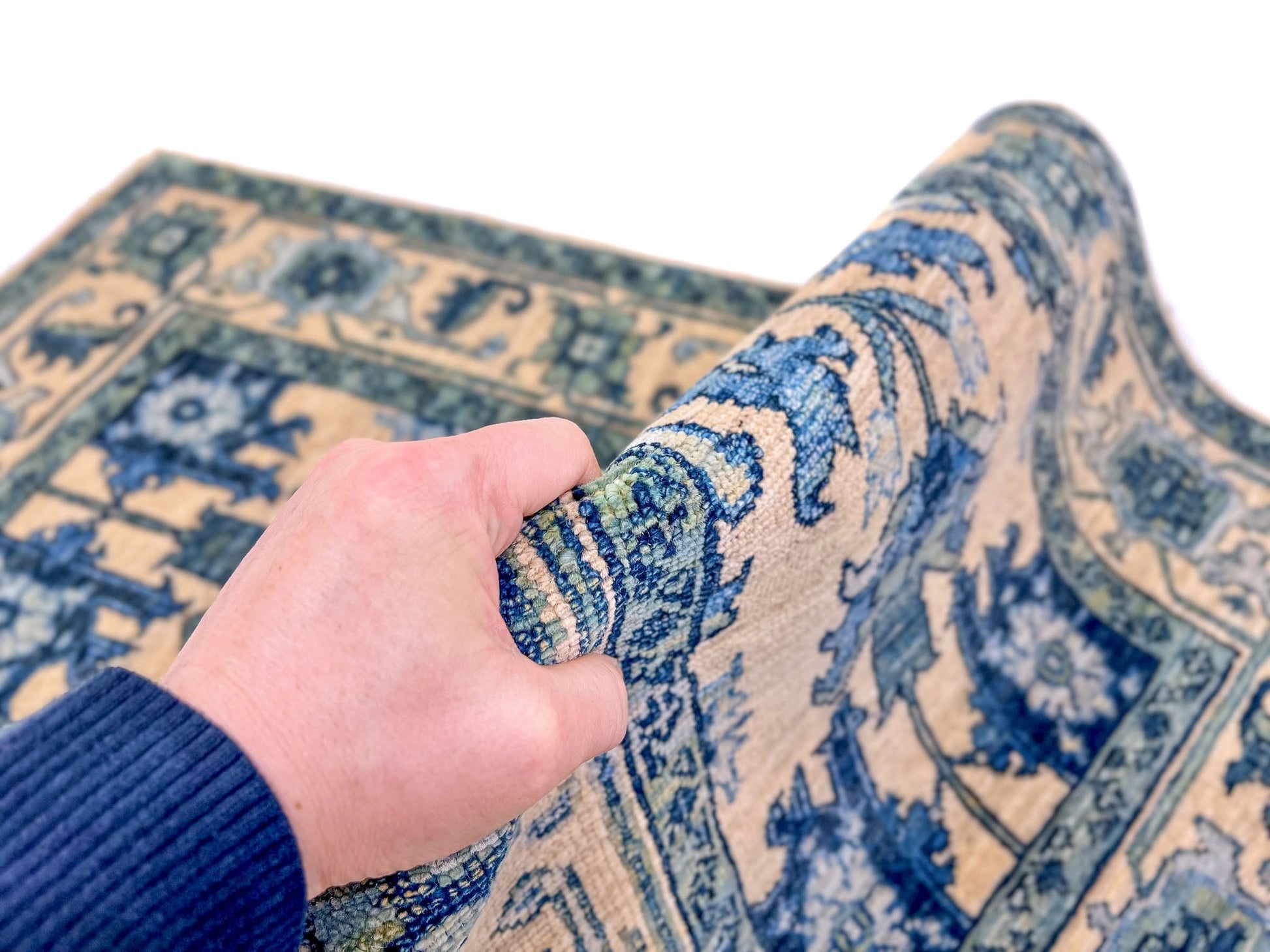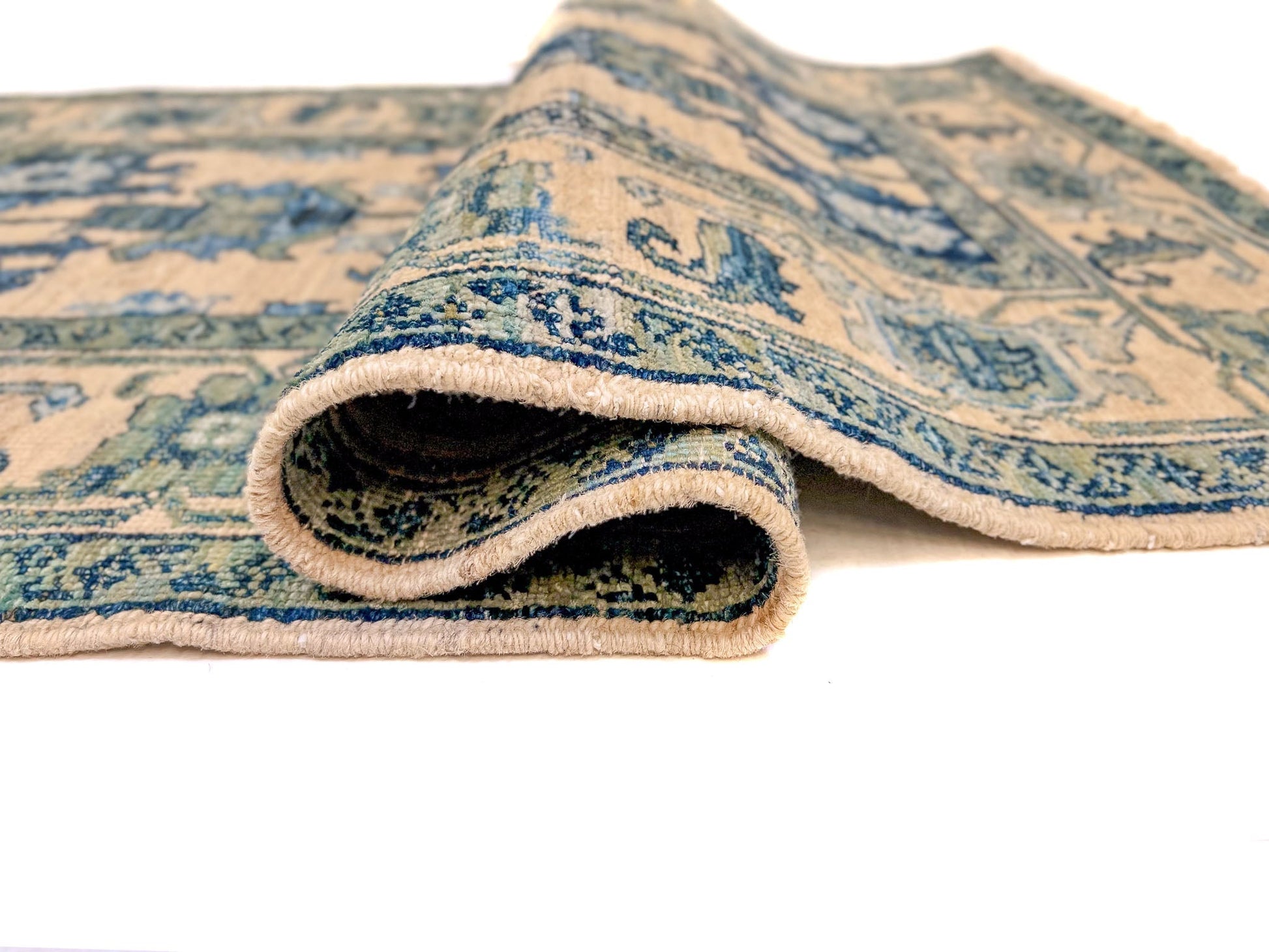 A new classic – modernized Afghan interpretation of a century-old, antique Persian Heriz design – hand-knotted of hand-spun, vegetable-dyed Ghazni wool – antique-washed and exported from Afghanistan