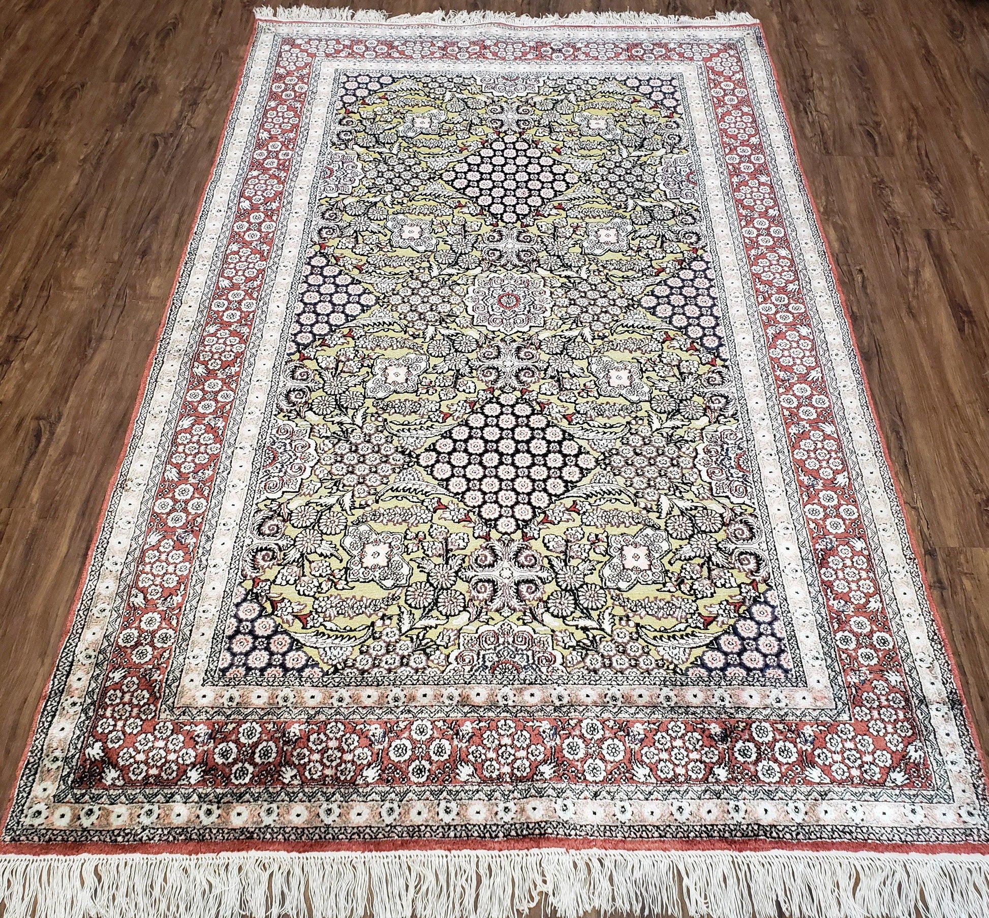 Vintage Silk Rug with Gold Threads, 5x8 Silk Oriental Carpet, Red Black Gold Hand-Knotted Fine Silk Real Gold Wire Threads Kashmiri Silk Rug
