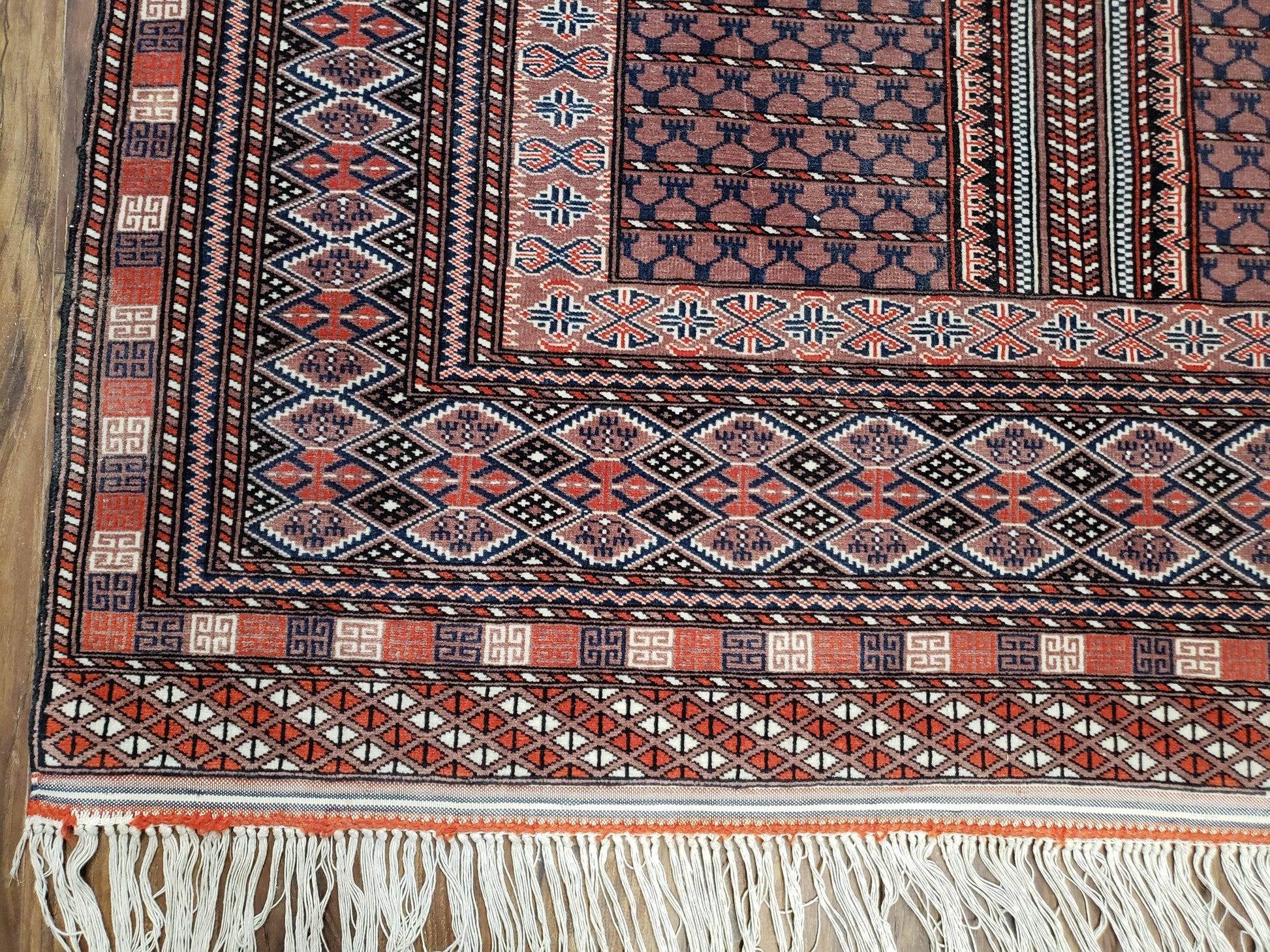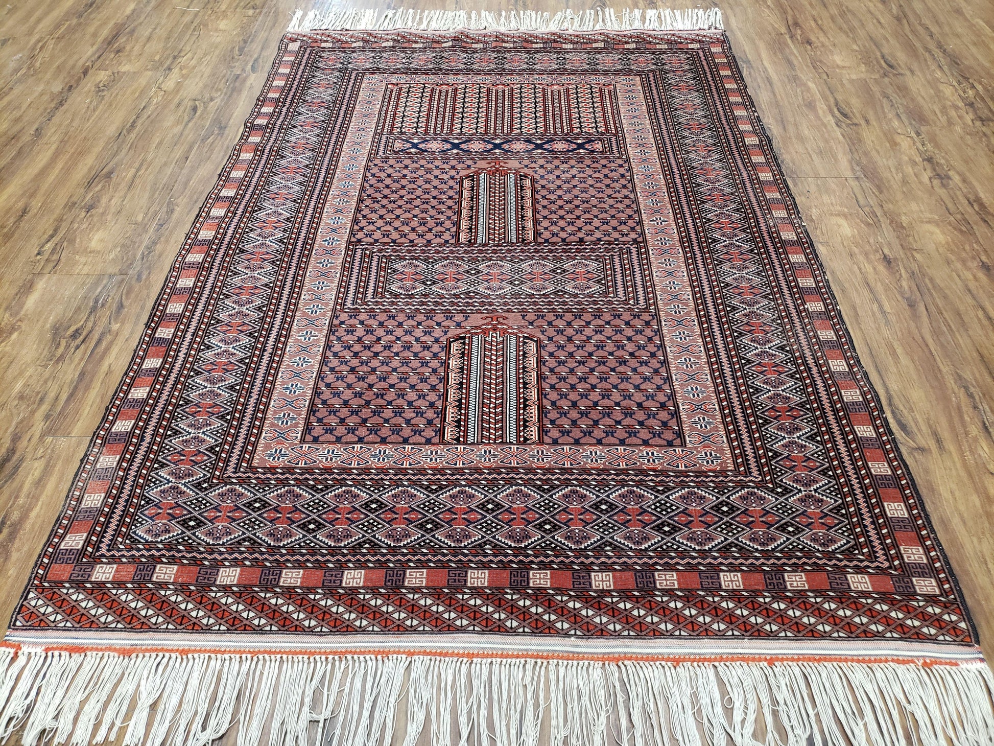 A Lovely Vintage Handmade Hand-Knotted Wool Turkoman Bokhara Area Rug. A great way to transform any space.