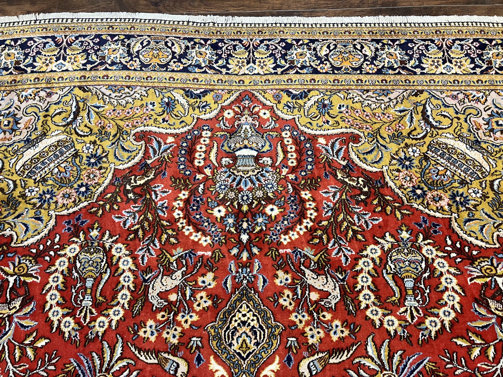 Wonderful Persian Qum Rug 10x14, Wool w/ Silk Highlights, Hand Knotted Semi Antique Vintage Carpet, Red, Floral, Fine Weave, Birds Deer Pictorials