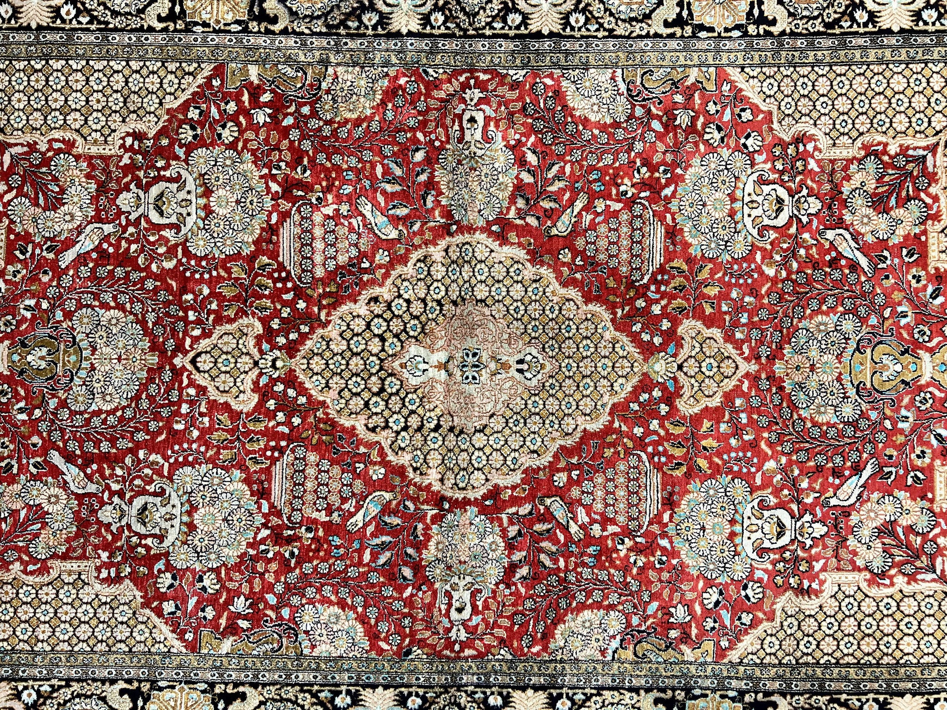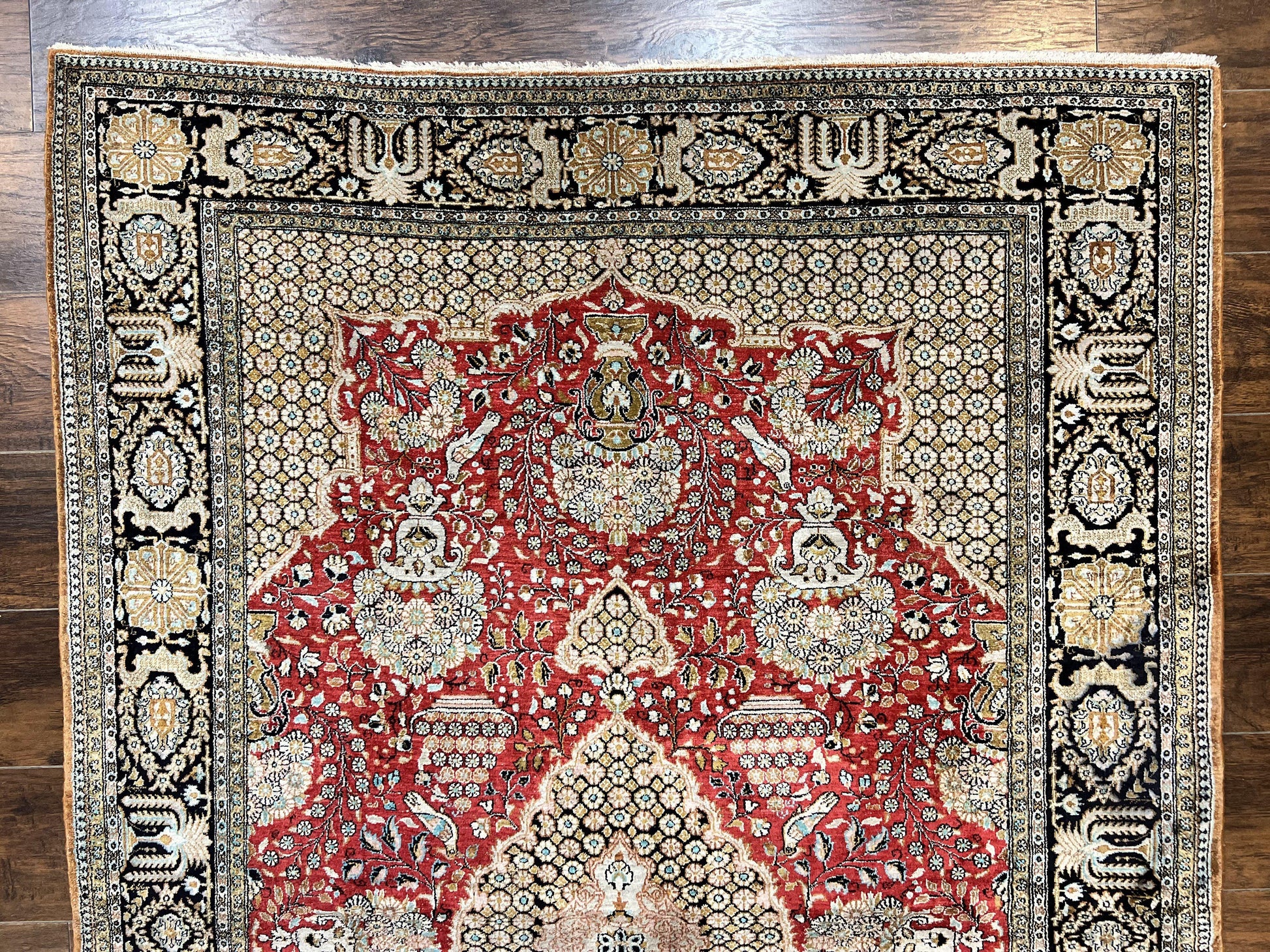 Wonderful Persian Silk Rug 5x7, Birds Floral Vases, Red, Hand Knotted Silk Fine Oriental Carpet, Handmade Vintage, Persian Qum Rug, 400 KPSI