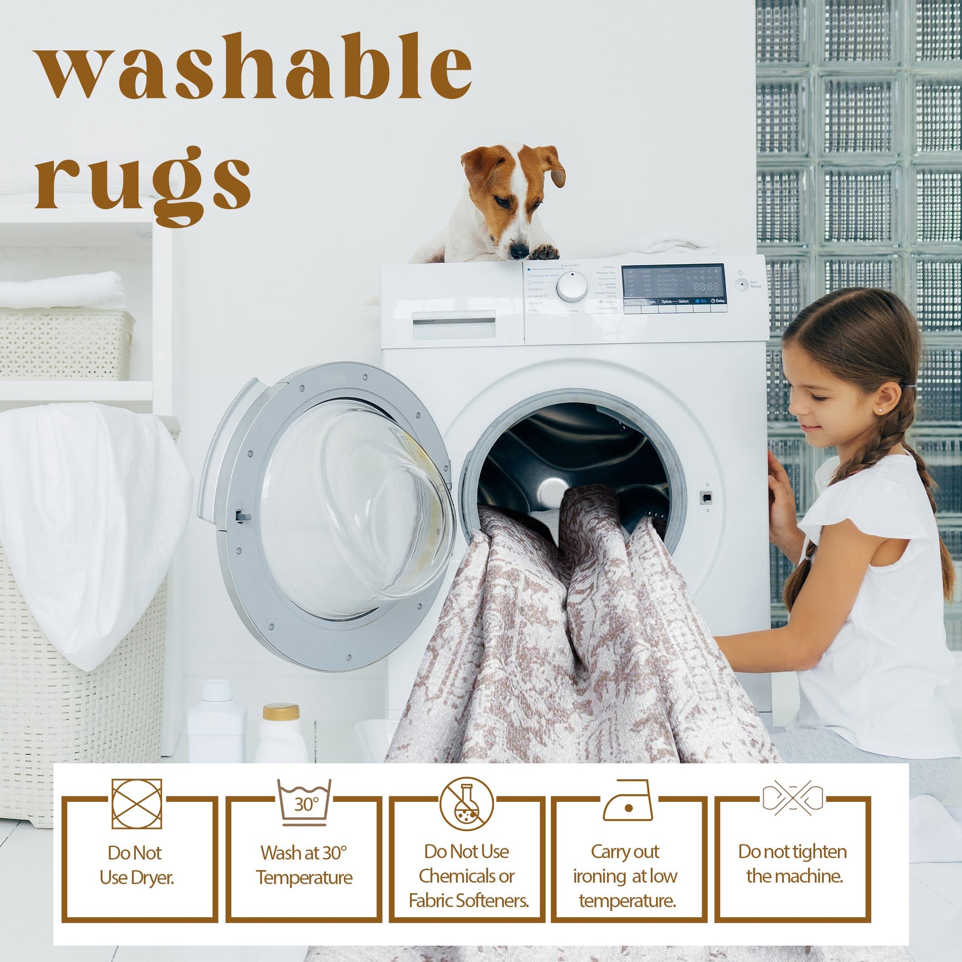 MACHINE WASHABLE FEATURE: FlashRug not only offer the practicality of machine washability but also allow for regular cleaning using vacuum cleaners to prevent dust and debris from penetrating the fibers. This ensures that your rug stays clean and well-maintained on a daily basis. It is important to note that when cleaning the product, it is advised not to use ultra-strong chemicals such as degreasers, softeners, or bleach, as they may potentially damage the rug's quality and appearance.